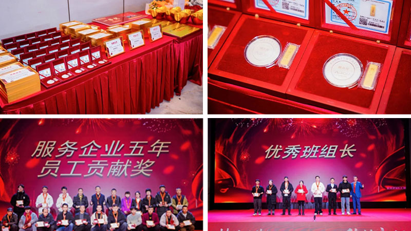 27 five-year employees received 100g pure silver medals; 7 ten-year meritorious employees received 60g pure silver medals plus 10g pure gold bars, in tribute to their long-term company and dedication.
